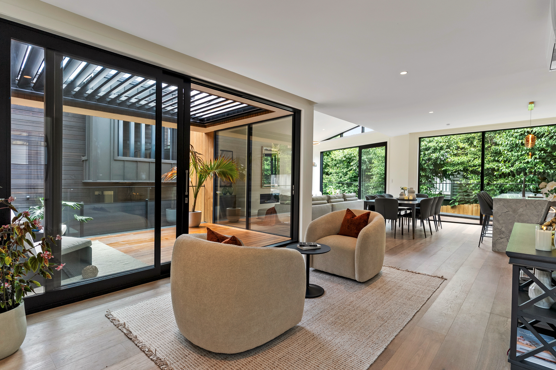 Intimate and calm yet bold, MacMurray's flair for distinctive design utilises space for superb indoor and outdoor flow. A striking palette of dark cedar and vast walls of glass allows its stunning outlook to infiltrate almost every room.